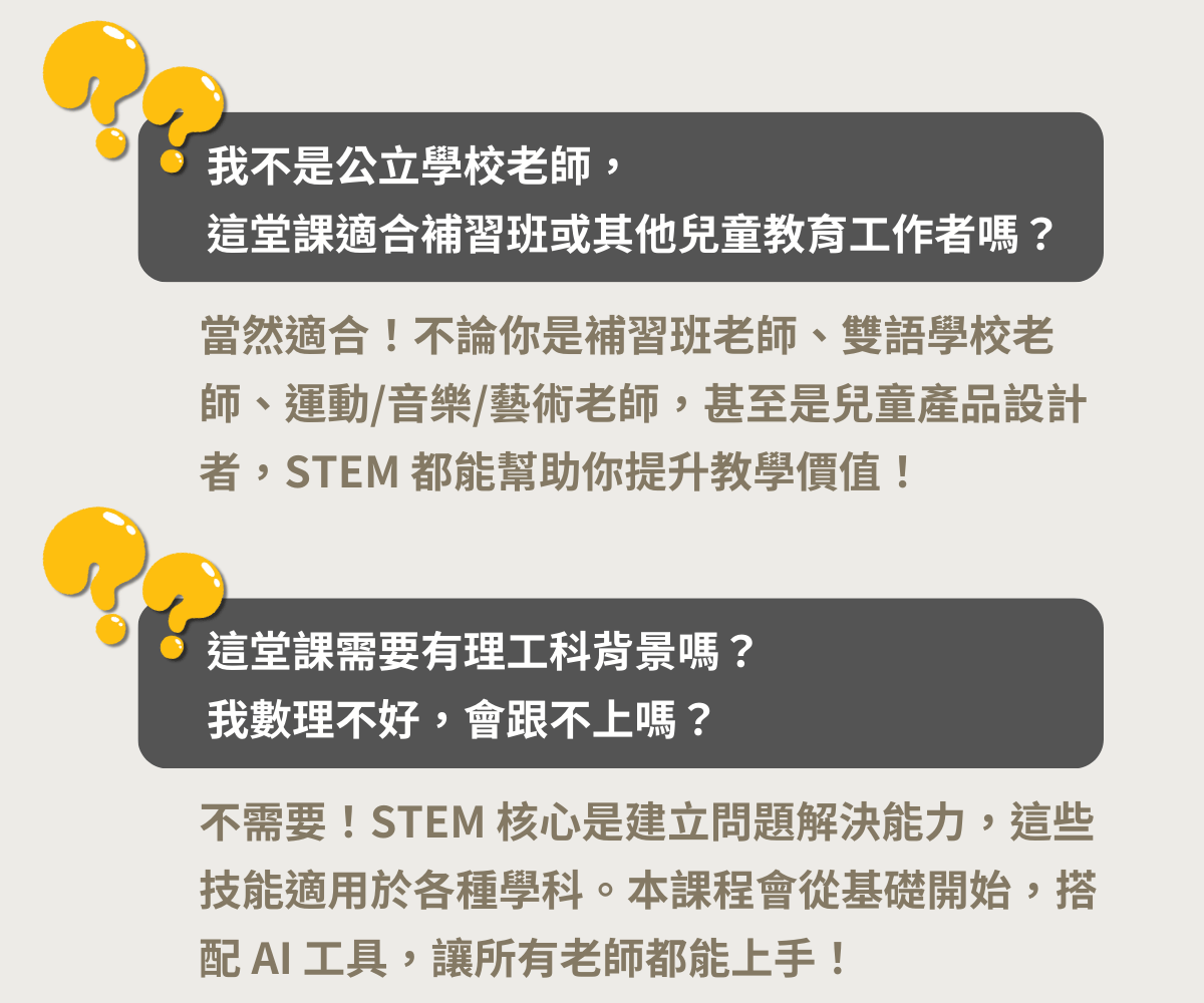 本課程也關注 STEM 公平教育與創新應用,結合 工程設計、設計思維、藝術科技,讓 STEM 教學更具影響力。透過實作與應用,教師將能有效優化教學,提升學生的學習成果與競爭力。