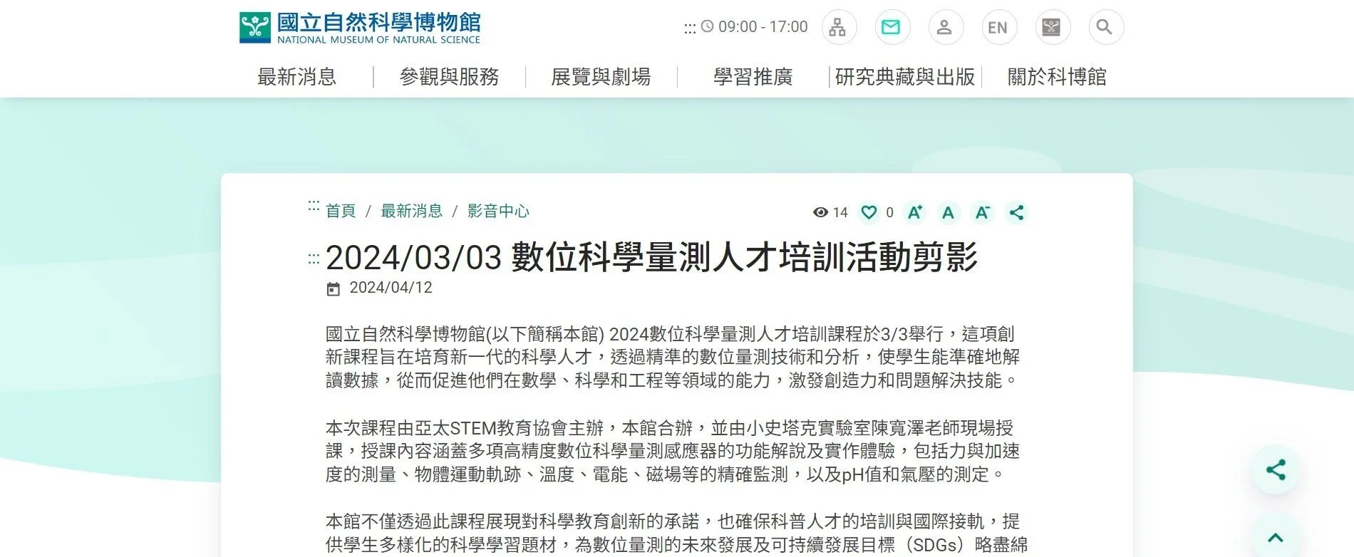 國立自然科學博物館(以下簡稱本館) 2024數位科學量測人才培訓課程於3/3舉行,這項創新課程旨在培育新一代的科學人才,透過精準的數位量測技術和分析,使學生能準確地解讀數據,從而促進他們在數學、科學和工程等領域的能力,激發創造力和問題解決技能。